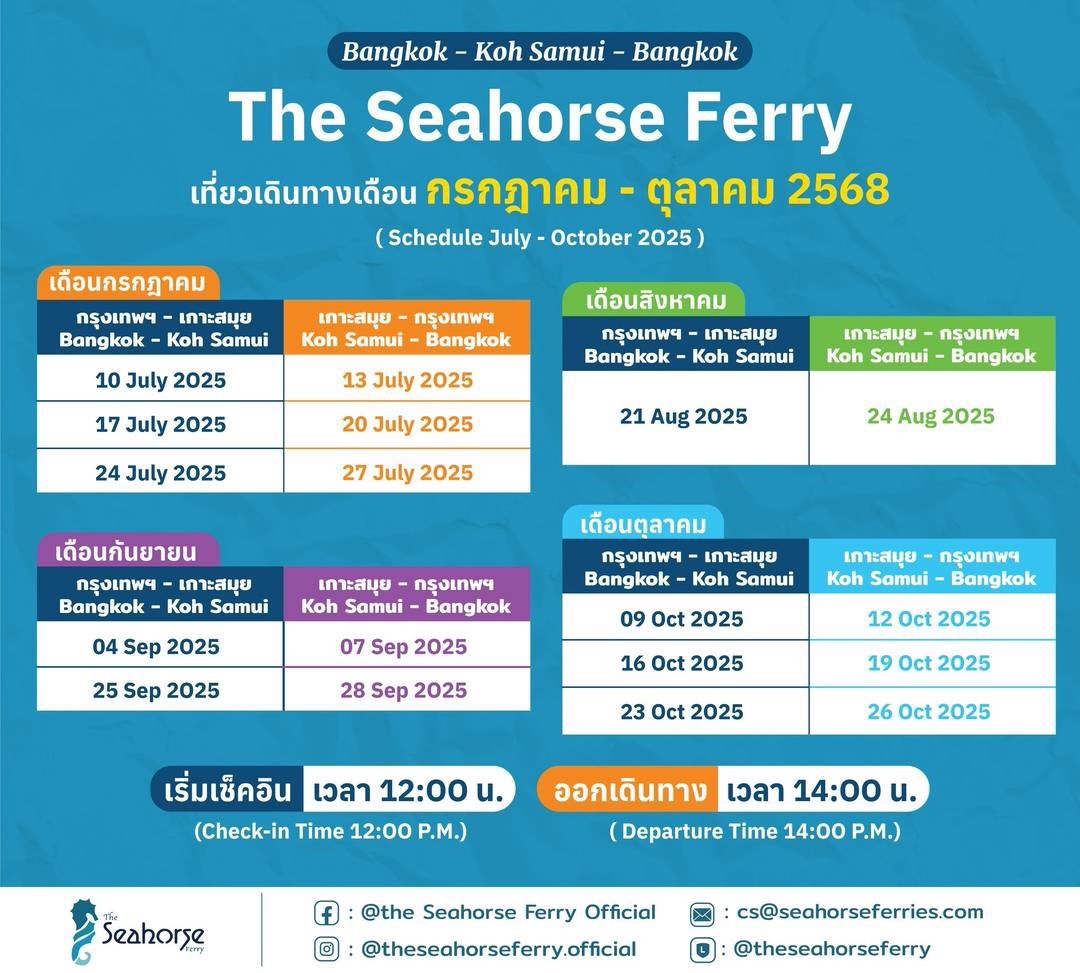 The Seahorse Ferry updates its sailing schedule for January - March 2026! Set off on a relaxing journey to the stunning blue waters of Koh Samui. Enjoy a chill cruise along the Chao Phraya River, unwind with an overnight stay on board, and wake up to a refreshing breakfast with vibrant ocean views. Before you know it… you’ll be arriving in Samui! 🌴